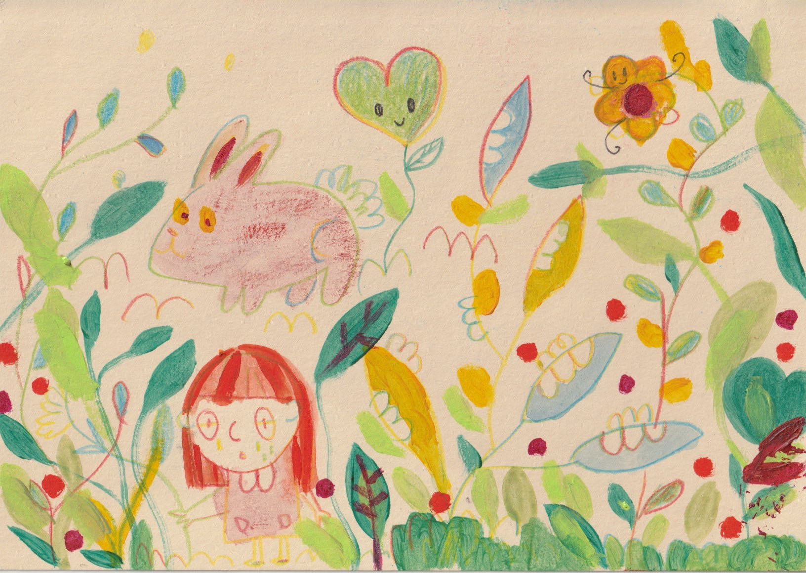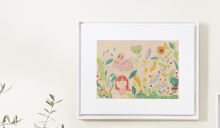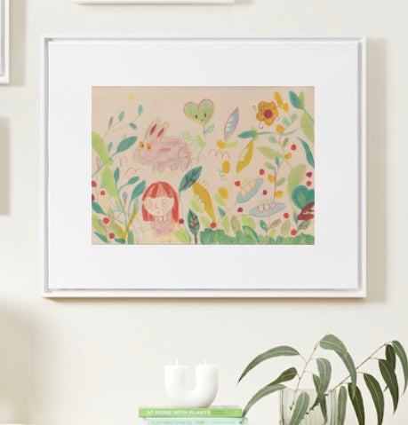 Dreamy garden full of gentle colours, a rabbit and a girl. This hand-painted A5 print brings warmth, imagination, and joy to any space, perfect for kids' rooms, gifts, or nature lovers.